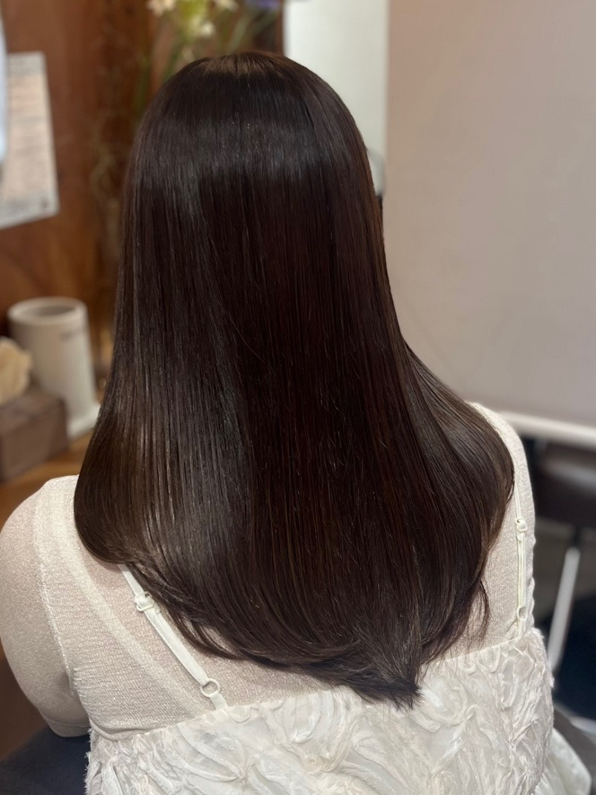 自然なストレート感を残しつつまとまりと艶を重視して施術しています。