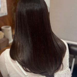 毛先までつるんとまとまり、光を反射する艶髪に変身しました。