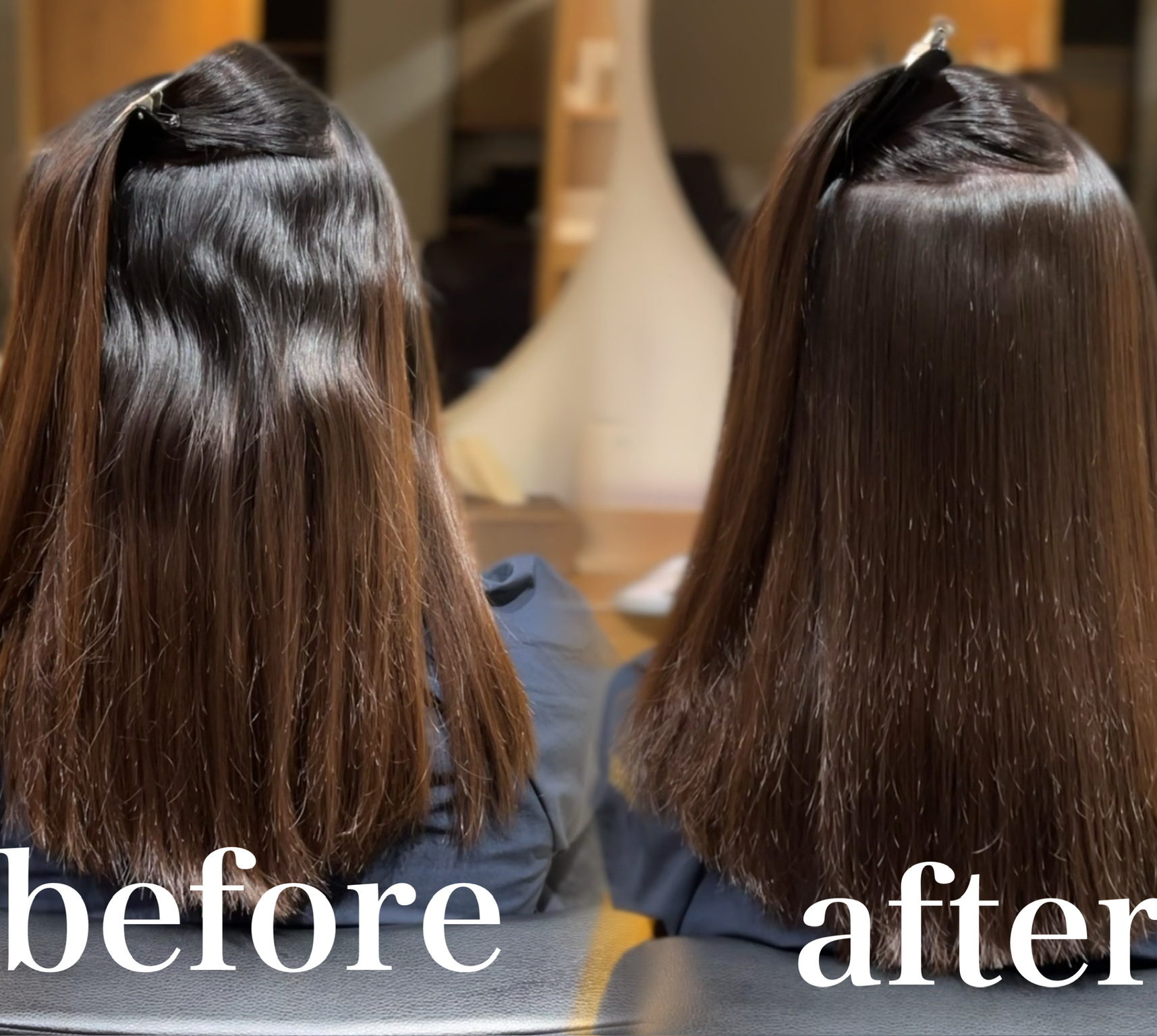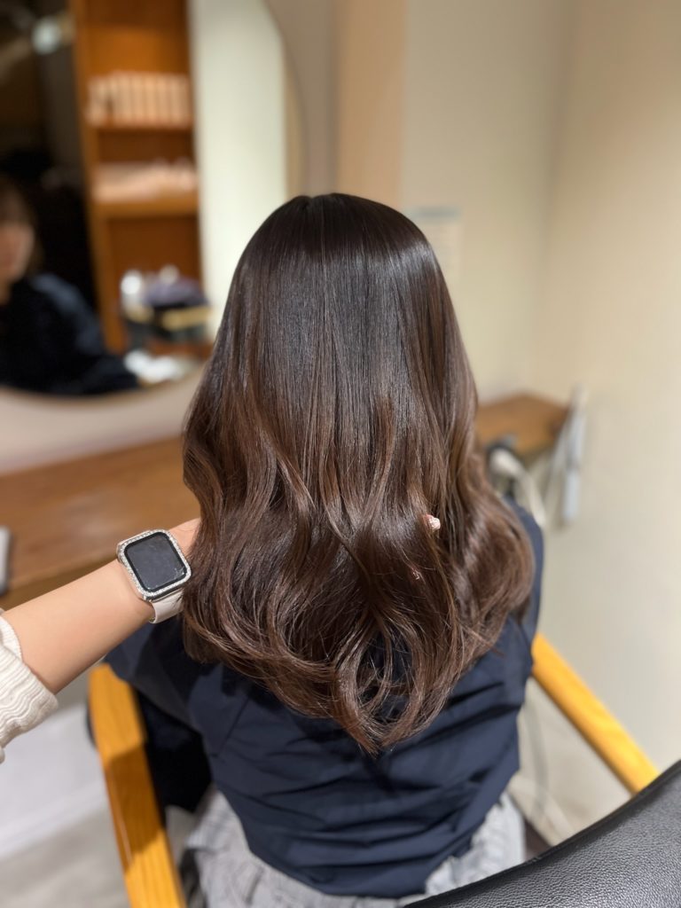 その結果、毛先の負担を抑えつつ、根元からのまとまりとツヤが戻り、手ぐしで収まる扱いやすい髪になっています。もちろん、コテ巻きも可能です◎